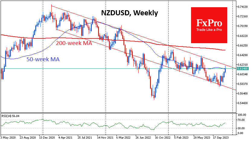 在较长的时间范围内,纽元兑美元几乎触及下行区间的上限,自2021年3月以来纽元兑美元主要遵循这一水平。今年,这对货币对在靠近下边界的地方停留了很久,而从上边界向下的逆转则非常迅速。在此走势区间,从波动范围的上边界到下边界仅用了5-6周的时间。如果第六次重复这种模式,纽元兑美元很可能会在1月初达到0.5750。