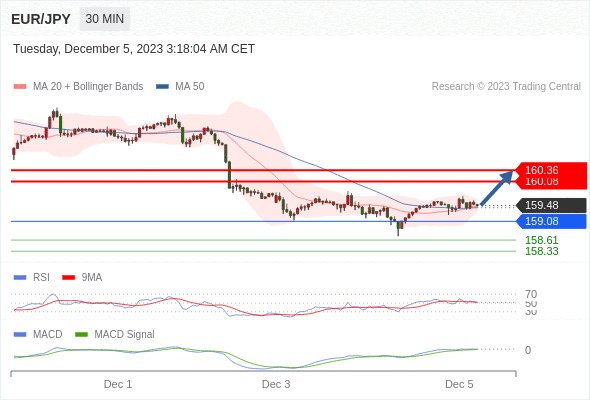 欧元/日元 当日内: 看涨,当 159.08 为支撑位。