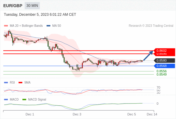 欧元/英镑 当日内: 看涨,当 0.8568 为支撑位。