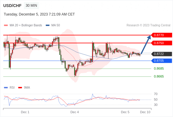 在 0.8705 之上,看涨,目标价位为 0.8750 ,然后为 0.8770 。