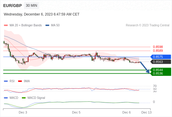 欧元/英镑 当日内: 看跌,在 0.8575 之下。