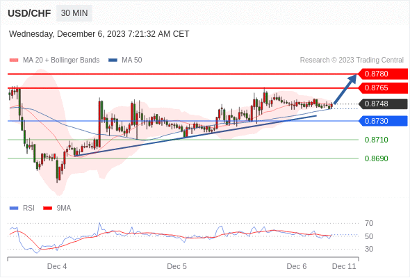 在 0.8730 之上,看涨,目标价位为 0.8765 ,然后为 0.8780 。