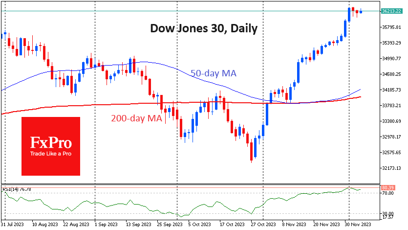 FxPro高级分析师Alex Kuptsikevich指出:道琼斯指数目前距离2021年12月的创纪录收盘价仅0.8%,距离历史高点仅2%,在过去五周的反弹中上涨了近12%。反弹如此之快,以至于每日图表上的相对强弱指数RSI已经超过了80,这是一个极度超买的区域。有时进入这一区间会引发更疯狂的反弹,表明投资者极度贪婪。