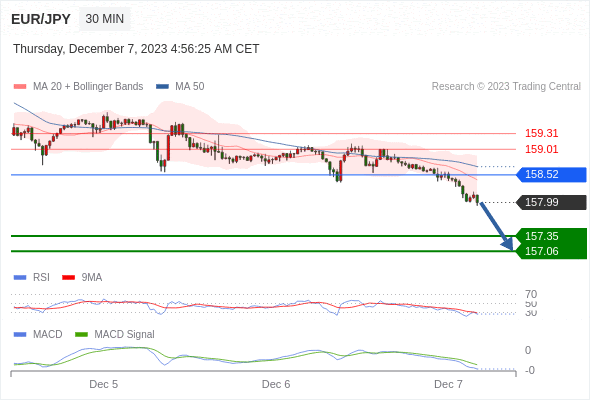 欧元/日元 当日内: 看跌,在 158.52 之下。