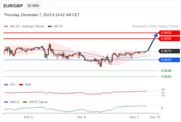 RSI技术指标超过50。 MACD技术指标呈现看多状态并 处在其信号线的下方。 此外,价位高于其20天及50天移动平均线 ( 分别位于 0.8573 和 0.8568 )。