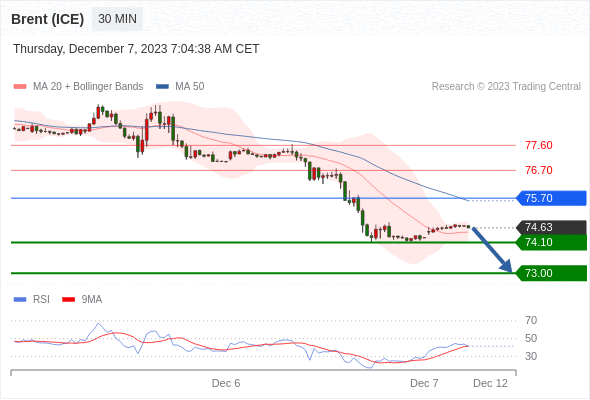 在 75.70 之下,看跌,目标价位为 74.10 ,然后为 73.00 。