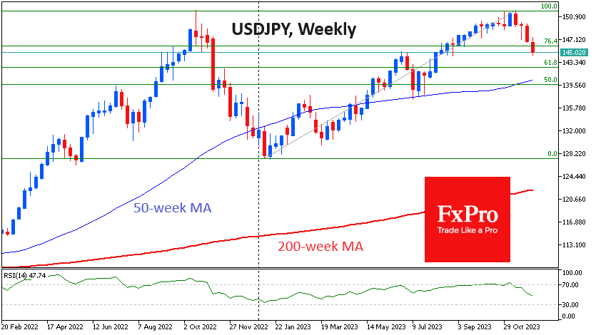 在较低的每日时间框架下,如果美元兑日元跌破142.4,我们可以讨论上行趋势的突破。200日移动均线与今年增长幅度的61.8%的水平相交于此。下方的盘整将表明该上升趋势将被打破,并将向128移动。尽管如此,我们应该为一场持久战做准备,并在接近143点时重新为日元多头做准备,因为即使在周线图上,日元相对强弱指数也会显著超卖。与此同时,在每日时间区域内的超卖退出可能只是下跌中的局部止损的一个原因,就像一年前日元走强周期一样。