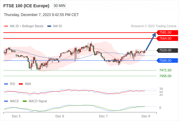 如跌破 7500 ,英国富时100指数期货 目标方向定在 7471.50 和 7455 。