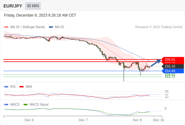 欧元/日元 当日内: 有上涨的可能,目标价位定在 156.01 。
