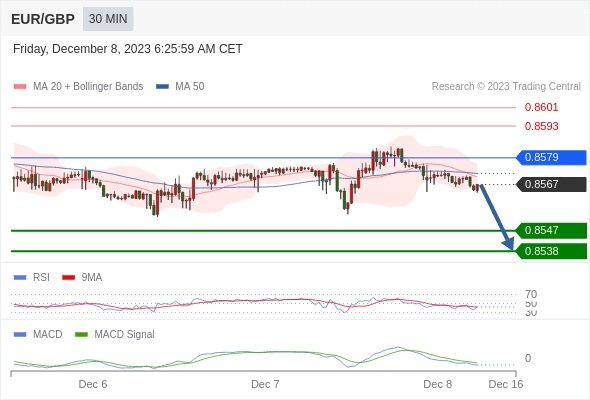 欧元/英镑 当日内: 看跌,在 0.8579 之下。
