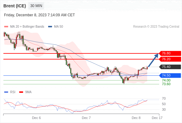 在 74.50 之上,看涨,目标价位为 76.20 ,然后为 76.80 。
