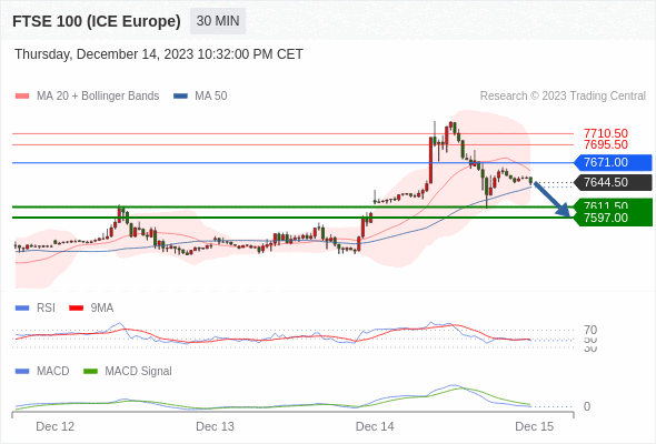 英国富时100指数期货 当日内: 当 7671.00 维持阻力位时,看跌,目标锁定在 7597.00 。