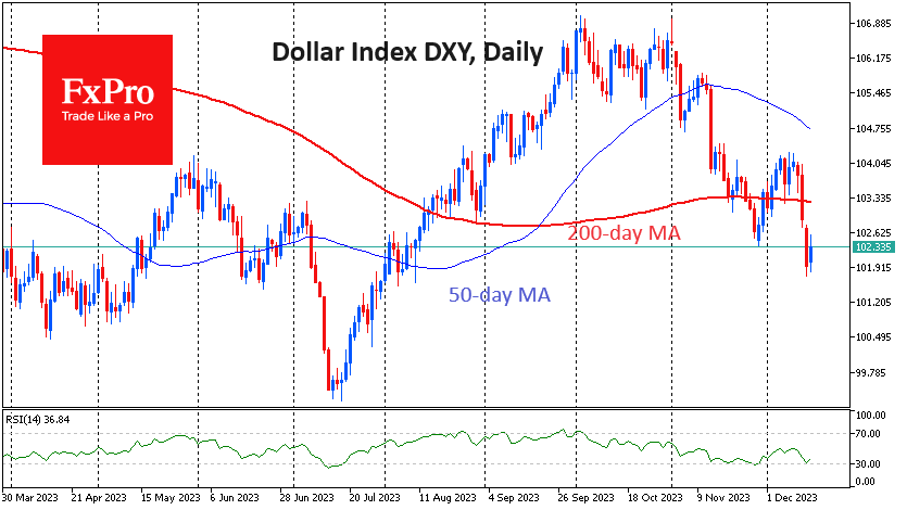 美元抛售的根本原因是对利率预期的重新评估。当美联储同意在2024年的预测中设定3次降息时,市场要求的降息次数是预期的两倍——6次。根据美联储观察(FedWatch)的数据,期货显示1月31日降息的可能性为15%,2024年3月20日降息的可能性为80%。两个月前,当美元指数形成峰值时,认为3月份加息的可能性为40%,1月份加息的可能性为50%。