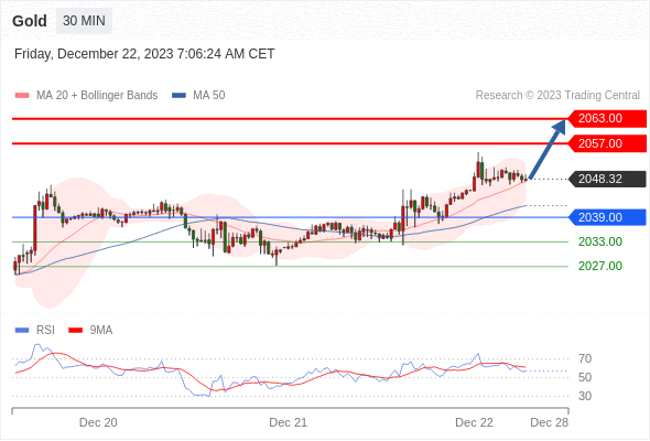 在 2039.00 之上,看涨,目标价位为 2057.00 ,然后为 2063.00 。