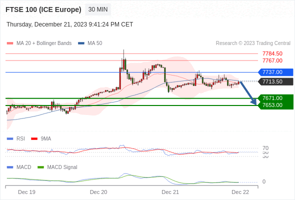 英国富时100指数期货 当日内: 逐渐下行,当 7737.00 为阻力位时,目标位定在 7653.00 。
