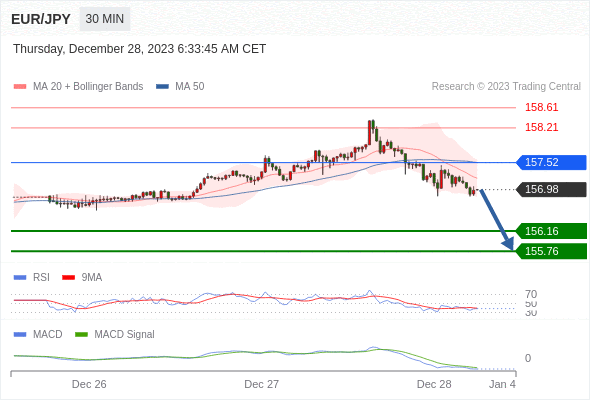 欧元/日元 当日内: 看跌,在 157.52 之下。