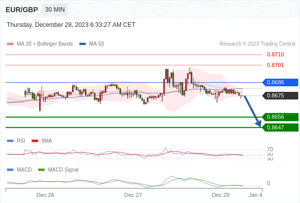 欧元/英镑 当日内: 看跌,在 0.8686 之下。