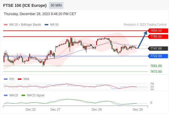RSI技术指标小于中性区域50。 MACD技术指标处在其信号线之上 看空。 此外,价位处在其20个时期及50个时期移动平均线下方 ( 当前是 7747.20 和 7756.77 )。查看交易中心全球研究部门今日的市场观点。从受欢迎的交易产品中探索新的交易方法与机会。