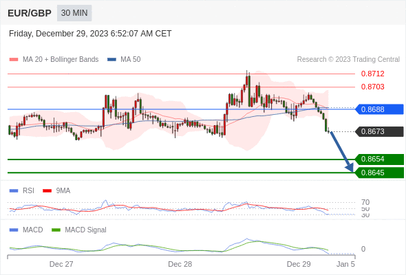 欧元/英镑 当日内: 看跌,在 0.8688 之下。