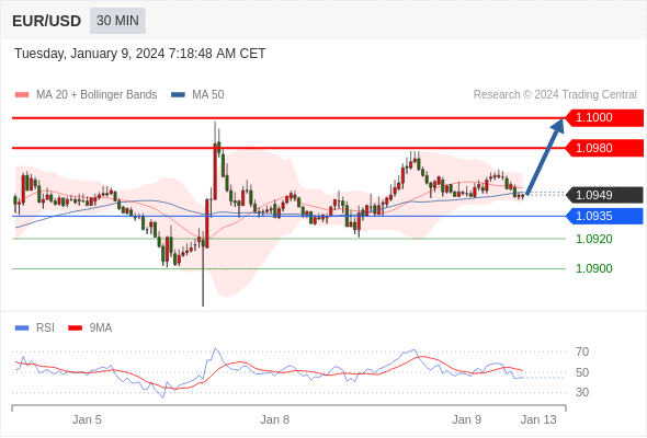 欧元/美元 当日内: 在1.0935之上,看涨。