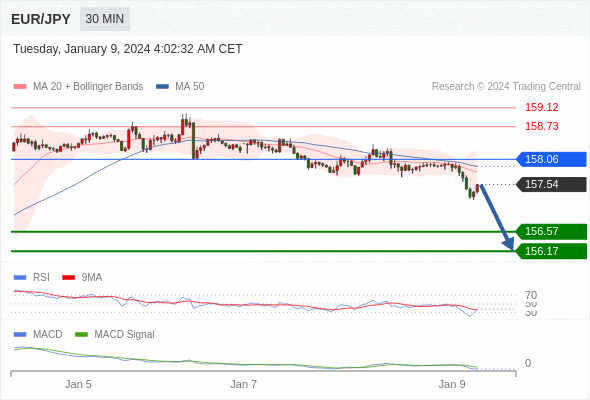 欧元/日元 当日内: 看跌,在 158.06 之下。