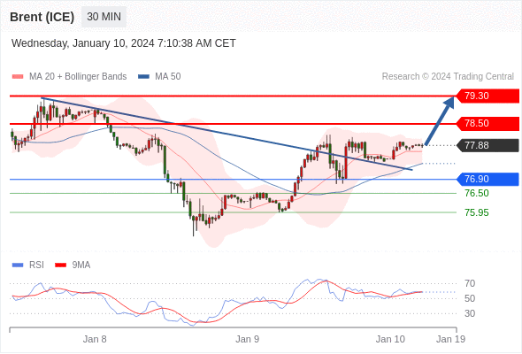 在 76.90 之上,看涨,目标价位为 78.50 ,然后为 79.30 。