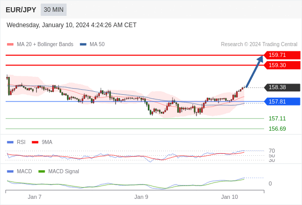 欧元/日元 当日内: 看涨,当 157.81 为支撑位。