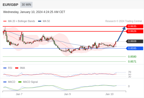 欧元/英镑 当日内: 看涨,当 0.8595 为支撑位。