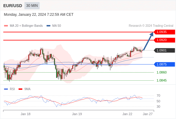 在 1.0875 之上,看涨,目标价位为 1.0920 ,然后为 1.0935 。
