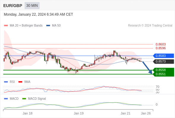 欧元/英镑 当日内: 看跌,在 0.8583 之下。