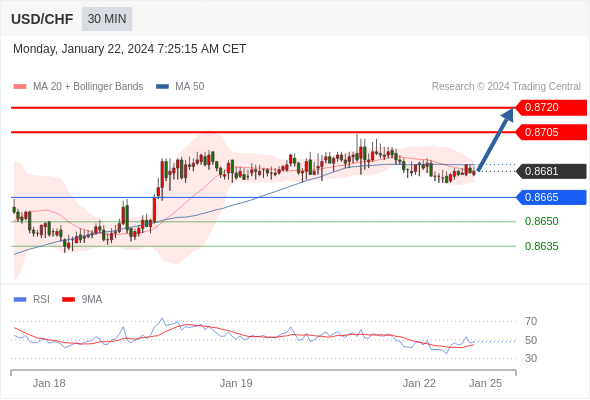 在 0.8665 之上,看涨,目标价位为 0.8705 ,然后为 0.8720 。