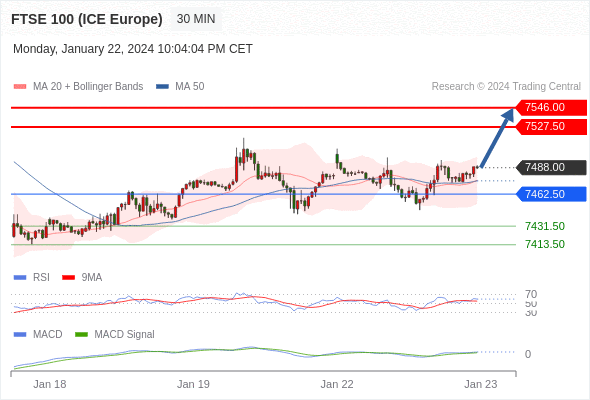 英国富时100指数期货 当日内: 看涨,当 7462.50 为支撑位。