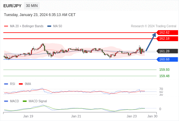 欧元/日元 当日内: 看涨,当 160.68 为支撑位。