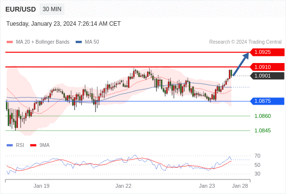 在 1.0875 之上,看涨,目标价位为 1.0910 ,然后为 1.0925 。