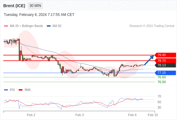 在 77.15 之上,看涨,目标价位为 78.70 ,然后为 79.40 。
