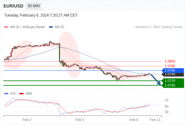 欧元/美元 当日内: 短期关键阻力位在1.0765。