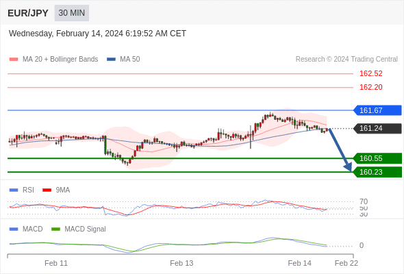 欧元/日元 当日内: 看跌,在 161.67 之下。