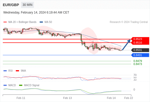 RSI技术指标小于中性区域50。 MACD技术指标呈现看跌状态并 处在其信号线的上方。 此外,价位处在其20天及50天移动平均线下方 ( 当前是 0.8504 和 0.8509 )。