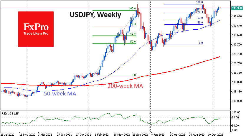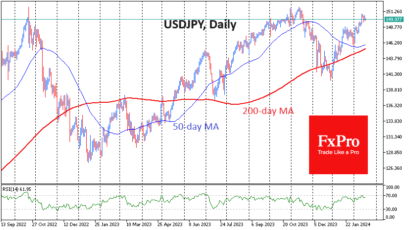 日元兑美元徘徊在150附近,从上周的151的四个月高点回落。对于短线交易者来说,150-152区域是危险的,因为这是日本财政部在2022年10月和2023年11月干预阻止日元贬值的水平。