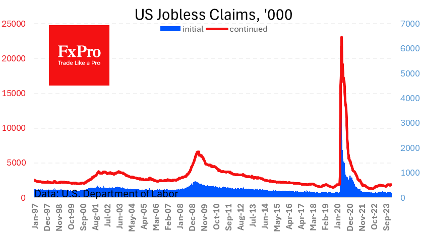 每周失业救济申请的发布可以被视为一个支撑因素。这是又一个强劲的数据,初次申请人数降至20.1万(为期五周的最低水平)。持续申领人数为186.2万,预计为188.5万。这一数据完美契合了美国经济强劲的形势,这将允许甚至迫使美联储不急于降息。