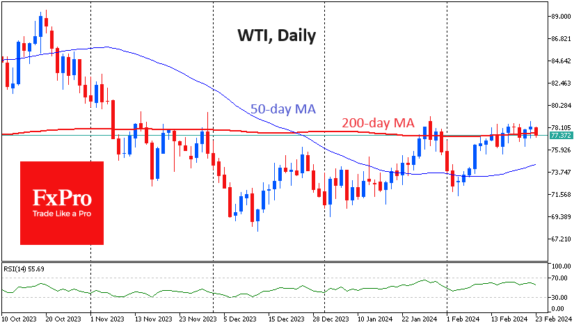 一周多以来,油价一直接近其200日移动均线。多头在1月底和去年11月未能突破这条线。此外,WTI股价接近每桶79美元的价格引发了大幅抛售。