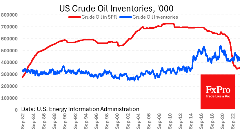 与此同时,石油库存正在上升。上周,商业原油库存再次增加了350万桶,使得过去4周的增幅达到了2230万桶。当前库存水平为4.43亿桶,比一年前低了7.5%。战略石油储备库存在一周内增加了75万桶,使得总库存从2023年7月的40年低点达到了1,275万桶。