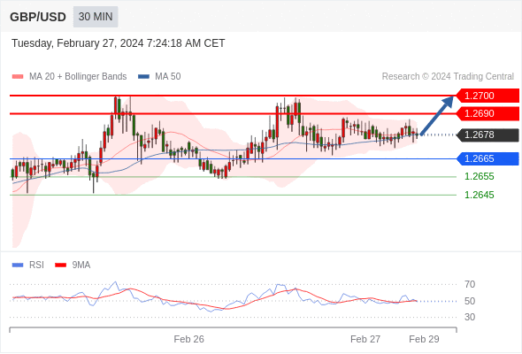 在 1.2665 之上,看涨,目标价位为 1.2690 ,然后为 1.2700 。