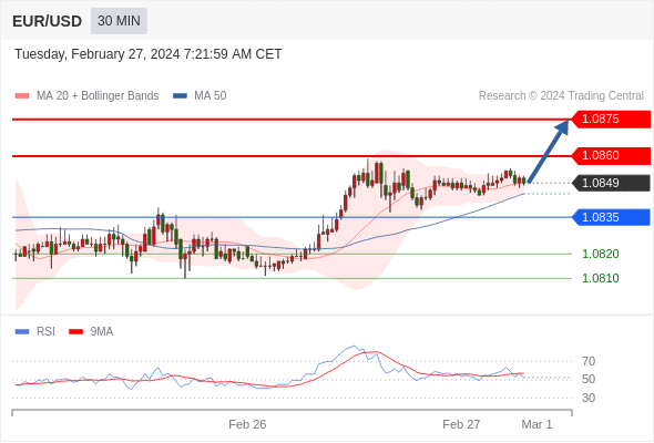 在 1.0835 之上,看涨,目标价位为 1.0860 ,然后为 1.0875 。