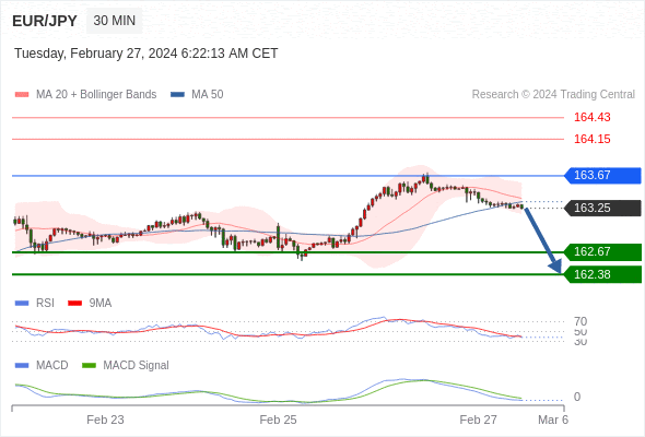 欧元/日元 当日内: 看跌,在 163.67 之下。