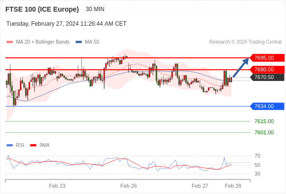 在 7634.00 之上,看涨,目标价位为 7680.00 ,然后为 7695.00 。