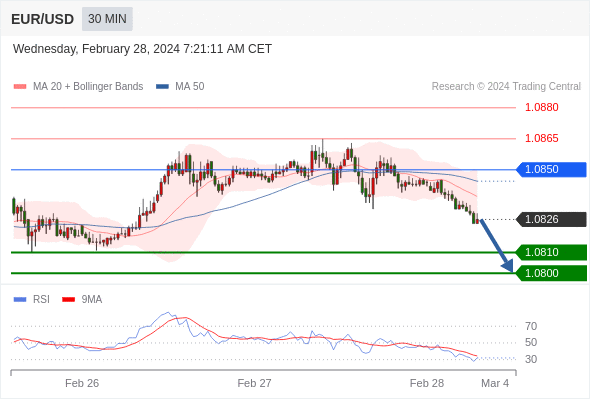 在 1.0850 之下,看跌,目标价位为 1.0810 ,然后为 1.0800 。