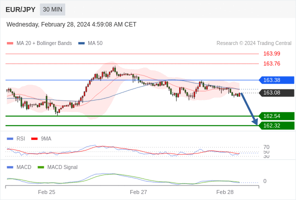 欧元/日元 当日内: 看跌,在 163.38 之下。