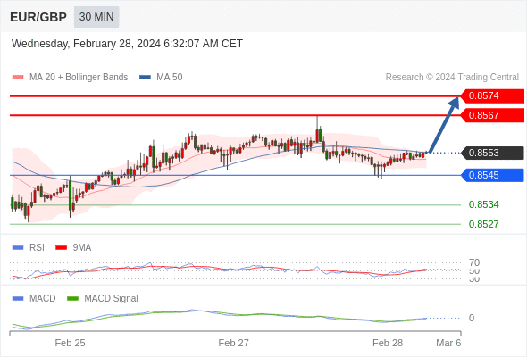 欧元/英镑 当日内: 看涨。