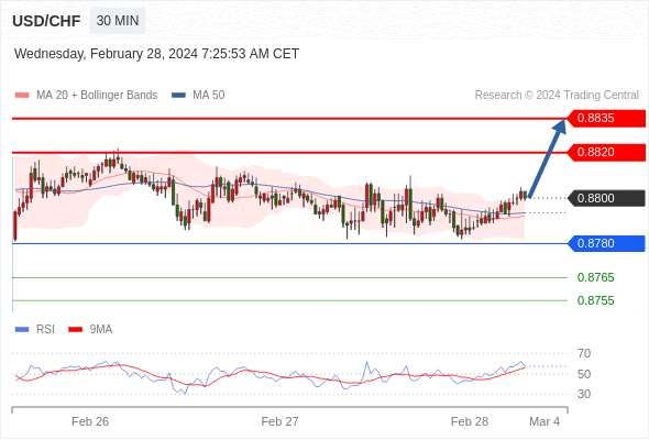 在 0.8780 之上,看涨,目标价位为 0.8820 ,然后为 0.8835 。